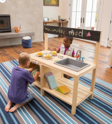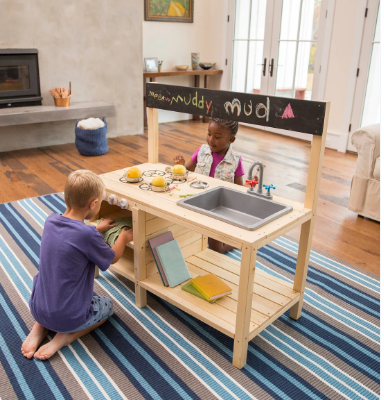 Whether your kids are whipping up the latest stone soup concoction, splashing with toy boats, or running mini construction vehicles through sand or pebbles—our Wooden Mud Kitchen & Sensory Play Station can handle it all. It’s a one-stop imagination station for your little mud-loving munchkins!