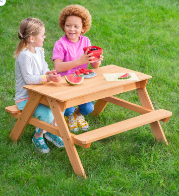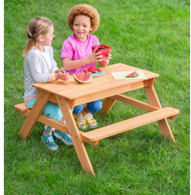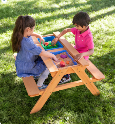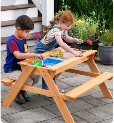 Our beautiful Wooden 2-in-1 Picnic Table Sensory Play Station beckons kids for all sorts of activities: summertime picnics, sensory play with sand or water, or the perfect spot to set up in the shade and read or draw! Lightweight and easy to move, this multi-use kids’ table has a removable tabletop revealing 2 plastic bin inserts. Fill the bins with sand, water, toys or other sensory items (not included)—each holds up to 16 lbs., or 1 gallon, of water or sand.