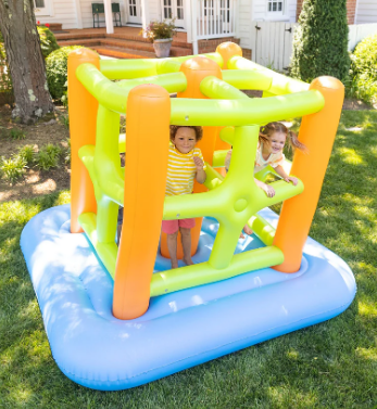 The bounce house is always a hit at birthday parties and backyard bashes. Our Giant 7-Foot Inflatable Bounce House and Climbing Cube packs big-time bouncing fun anytime and anywhere! It gives kids a fun and safe way to burn off extra energy that has them bouncing off the walls (literally). Kids will build strength and coordination as they jump around the outside or inside of the huge, safe bouncing platform; climb and scale the sturdy extra-thick vinyl columns; and shimmy up the inflatable center beam. Parents will appreciate that there's no noisy continuous air-blower with cumbersome cords, and no need to permanently install a climbing wall, for kids to enjoy bouncing and climbing to their heart's content!