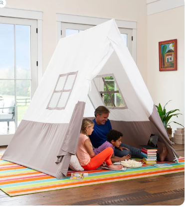 Give creative kids a pleasing place of their own to set their imaginations free inside this 7-Foot A-Frame Tent! The 5¼'L x 6½'W x 7'H tent is large enough for several kids to play or hang out together. Featuring a natural ivory color with a complementary dark grey border, this play space is easy to personalize with kids’ own colorful blankets, pillows and toys—and this complete set includes our outdoor-rated string lights to extend play into the night (three AA batteries required, not included)!