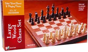 This high quality Wooden Chess Set includes 100% wooden pieces and wooden chess board. Board measures 15" by 15". it features solid wood board and playing pieces