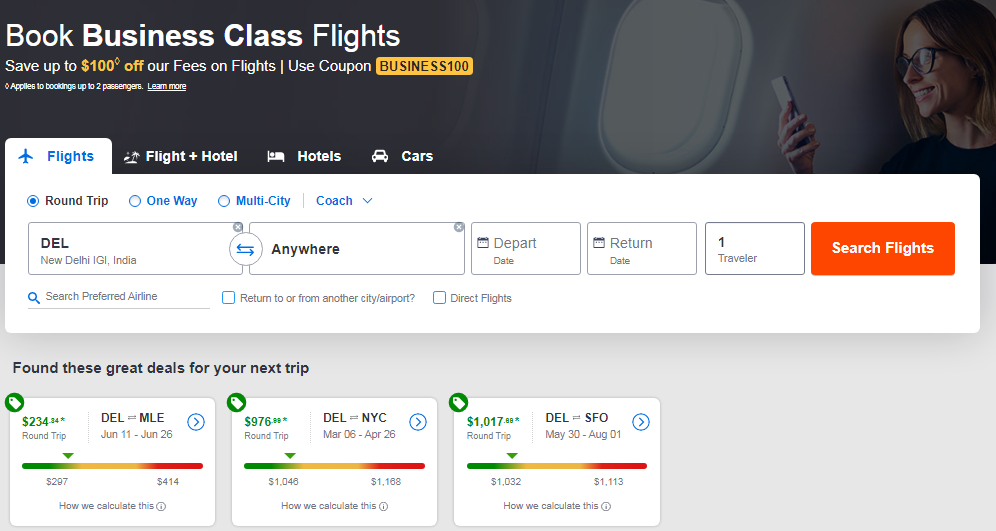 Get discounts on business class travel at CheapOair! Find affordable class air travel deals to world's popular destinations and enjoy the comforts and luxury of Premium class with savings on your next business class ticket! Whether you're a frequent traveler or an occasional traveler, now you can save big with our handpicked business class fares. Experience hassle-free journey by booking upper class flights on CheapOair! Enjoy unimaginable hospitality and superior in-flight amenities, such as high-speed wireless Internet, complimentary snacks, beverages and much more. We bring you the discounted class air travel deals to help you save big on your next trip!