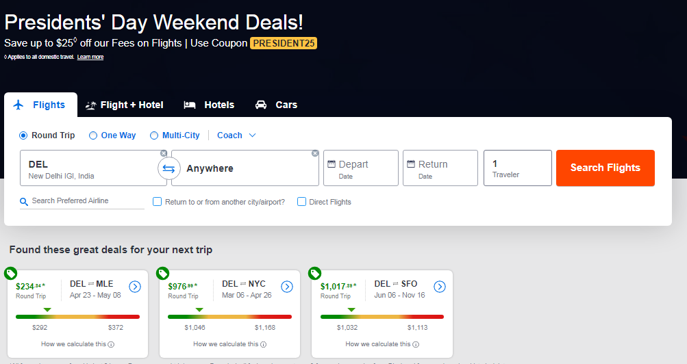 Great news! We have great Presidents' Day flight deals for you. Take advantage of our latest Promo Code today and you'll save even more on cheap flight, hotel, and car rental deals!