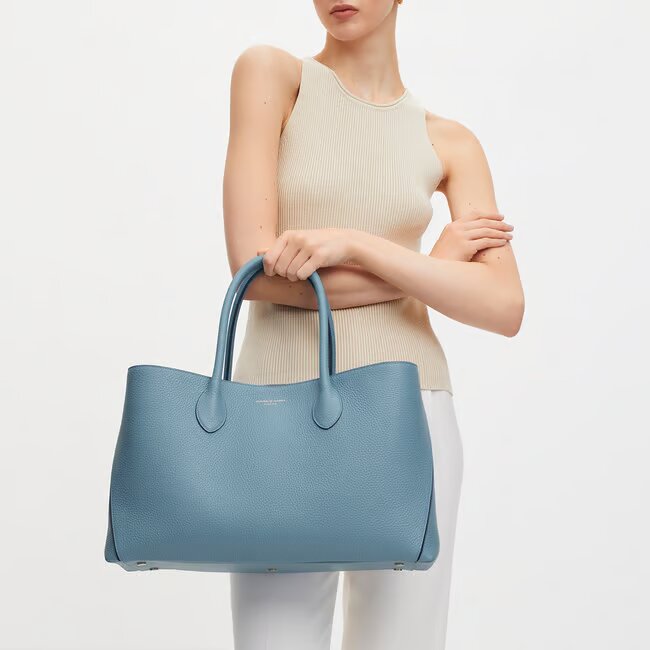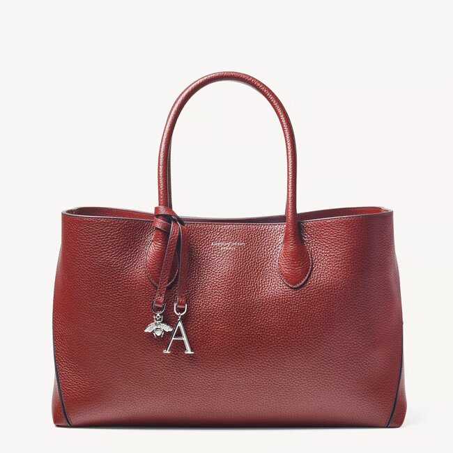 The London Tote Bag, now available for up to 50% off, combines simplicity and sophistication, making it a perfect everyday companion. Handcrafted from premium full-grain leather, it features a semi-structured shape that stands out with two stitched 'A' panels on the sides. Signature Bee & 'A' charms, along with subtle front branding, add a touch of elegance to this timeless design.