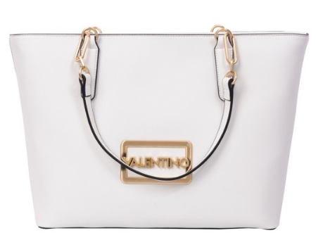 Women's White Princes Metal Plaque Tote from Valentino Bags. This spacious tote is perfect for everyday use, accentuated with chunky gold hardware on the front. It comes with twin handles for easy carrying and a long, detachable shoulder strap for added versatility. Elevate your style with this large white tote, adorned with eye-catching gold hardware, making it a statement piece for any occasion.
