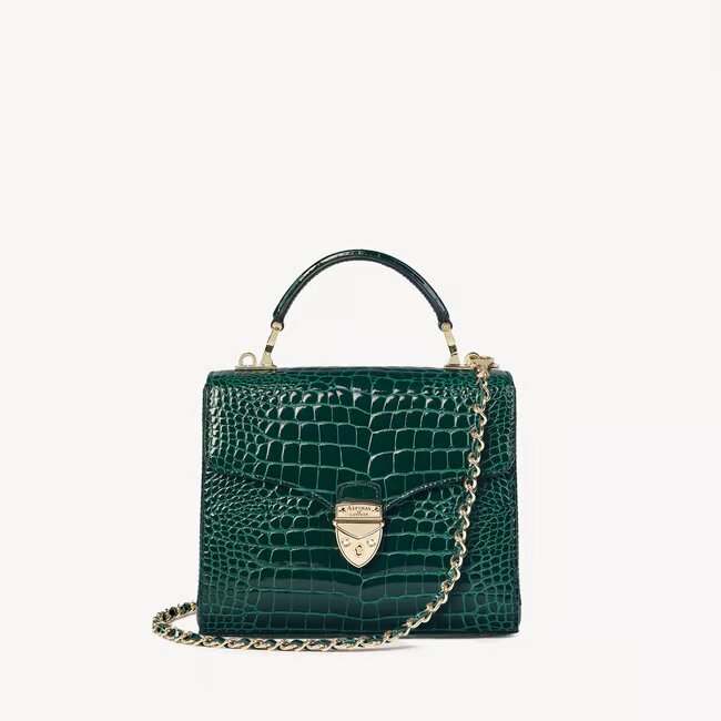 The Midi Mayfair Bag in Evergreen Patent Croc is a compact, top-handle design crafted from the finest full-grain leather, embodying timeless elegance. It features the distinctive signature shield lock that defines this memorable collection, opening to reveal a luxurious grosgrain-lined interior complete with a central zip compartment and open side pockets for organized storage. Designed for versatility, this bag can be carried by the top handle or worn as a crossbody with the detachable chain strap, making it a chic and functional addition to any outfit.