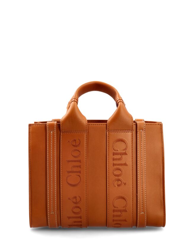 Introducing CHLOE, a small Woody Tote Bag priced at $1517, including shipping. This elegant bag features dimensions of 20 cm in height, 26.5 cm in width, and 8 cm in depth. It comes with two short handles and a removable long strap for versatile carrying options. The bag boasts a spacious main compartment, along with an internal flat pocket for added organization. Crafted from 100% leather, the CHLOE Small Woody Tote Bag is proudly made in Italy.
