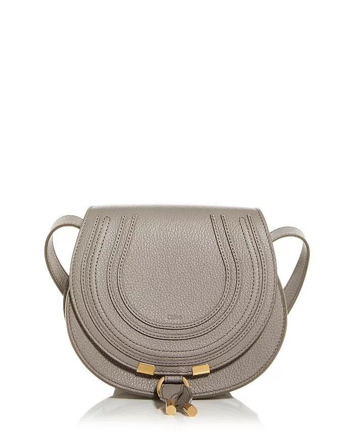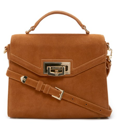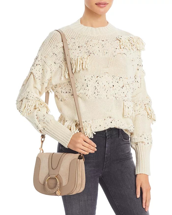 Hana Small Leather & Suede Crossbody, a blend of versatility and sophistication. Its adjustable, removable strap offers a 20.5" drop for effortless customization. Compact yet spacious at 8.5"W x 2.25"D x 6.2"H, it features a magnetic snap closure for secure storage and interior compartments for organization. The suede front flap boasts signature ring hardware, and the closure features the brand's logo and charming logo charms in elegant gold-tone hardware. With a fabric lining adding a touch of luxury. Model Measurements: 5'10" height, wearing a size 4 or small.