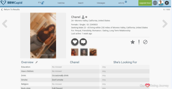 rofile quality on BBWCupid is high, with detailed information available to help users understand each other's characteristics, romantic preferences, and cultural beliefs at a glance.