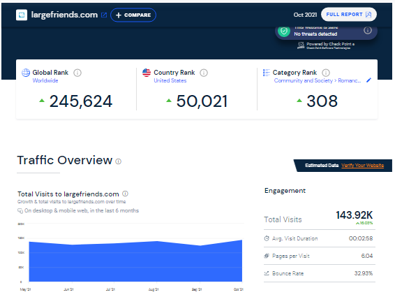 LargeFriends.com boasts approximately 350,000 members from the United States alone, with the site receiving around 60,000 monthly visits. While the platform accommodates users from various countries worldwide, the majority hail from English-speaking nations such as the United Kingdom, the United States, and Australia. Additionally, LargeFriends has gained popularity in Europe, including countries like France, Germany, and Spain, as well as in Asian regions like Hong Kong, Singapore, and China. Interestingly, there is a higher proportion of male users compared to female users on the site.