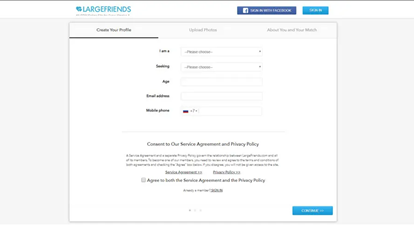 Signing up on LargeFriends follows a familiar process similar to other dating sites, where users have the option to register using their Facebook account. Additionally, individuals must be of legal age to sign up. The registration process is divided into three parts, ensuring a comprehensive and straightforward approach to creating a profile on the platform