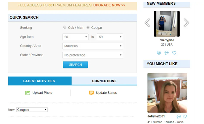 Older Women Dating features a simple user interface. While it may seem a bit outdated, this does not impact its functionality. Some elements appear out of place, with less crucial items positioned at the top and some necessary features slightly hidden. The design is user-friendly, contemporary, and appealing, similar to social networking sites like MySpace or Facebook. Upon entering the site, you will first encounter advertisements promoting premium membership, followed by the essential search box. The search tool is vital and is placed in a sidebar to allow more important information, such as photos and other content, to take center stage.