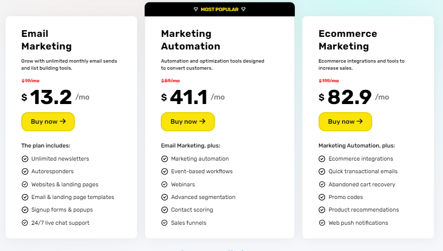 GetResponse offers four main pricing plans, each designed to meet the needs of different business sizes and requirements. Pricing is based on the number of contacts in your list, with discounts available for annual and biennial subscriptions.