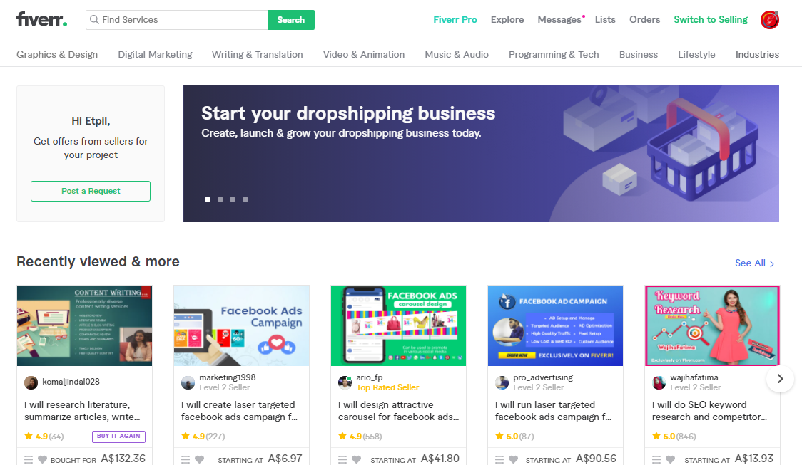 Each category has further subcategories. Buyers can explore these subcategories or simply search for specific keywords. Although prices start at $5, enhanced services or faster deliveries entail higher prices.