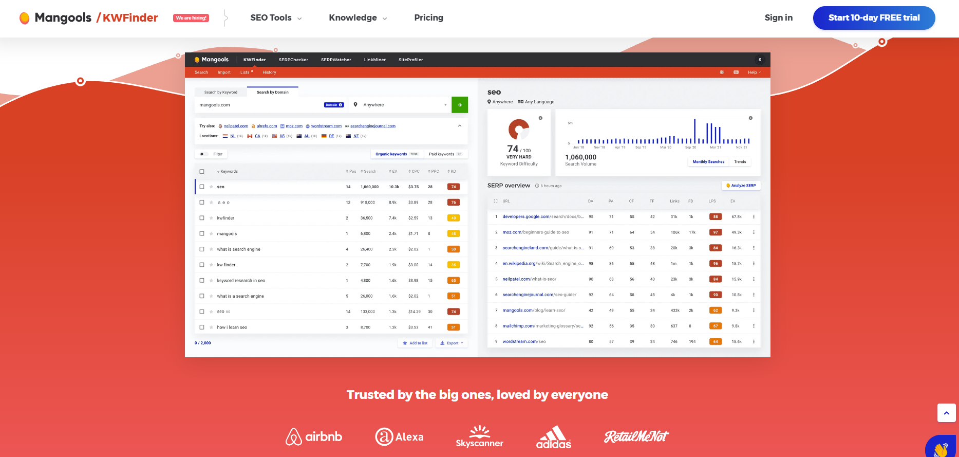 • Integration with Mangools Suite: KWFinder seamlessly integrates with other tools in the Mangools suite, including SERPWatcher for rank tracking, LinkMiner for backlink analysis, and SiteProfiler for c