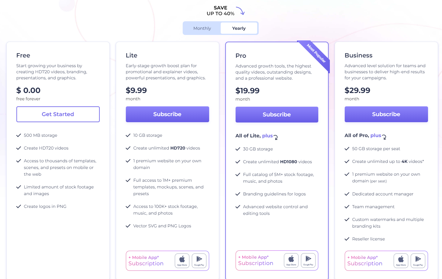 Renderforest offers several pricing packages to cater to different user needs: Free, Lite, Pro, and Business. Here's an overview of each pricing package: