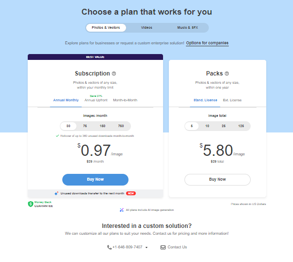 If your image needs vary from month to month, Depositphotos offers on-demand packs. Choose from a selection of options, including 3 images for $42 or 11 images for $65. Need more flexibility? Grab 25 images for $99 or go big with 100 images for $299. These packs are ideal for one-time projects, allowing you to pay for only what you need without any monthly commitments. Best of all, each pack comes with a standard royalty-free license, making it perfect for blogs and most commercial uses.