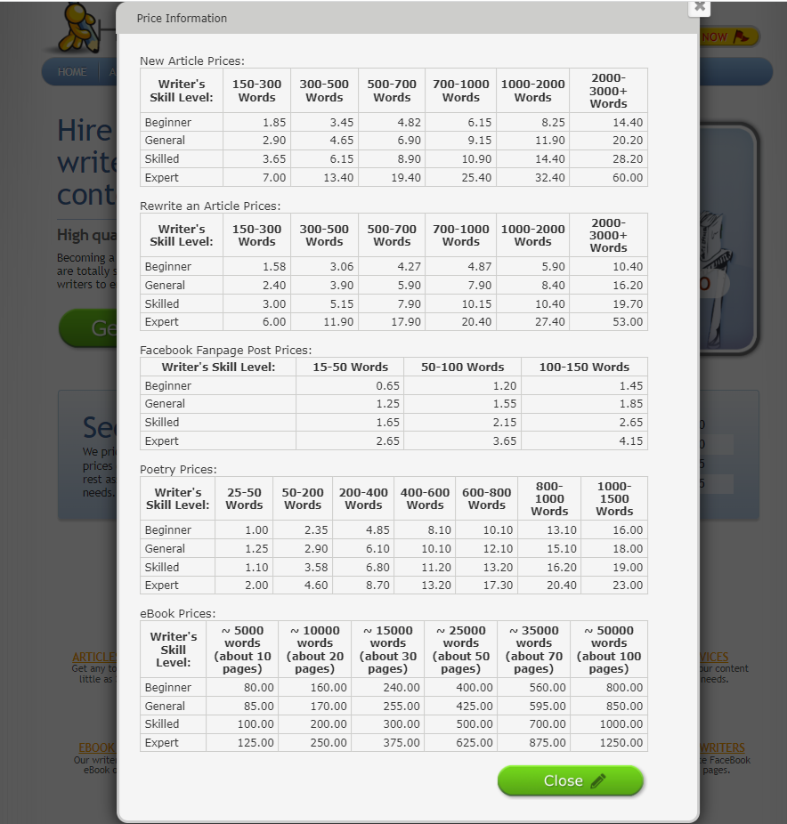 Engage writers for your content needs at affordable rates, starting as low as $1.5 per article. While many customers benefit from highly competitive prices, premium articles from experienced experts may command a slightly higher cost. Explore the price comparison table below to gain insights into the pricing structure based on the skill level of the selected writer.