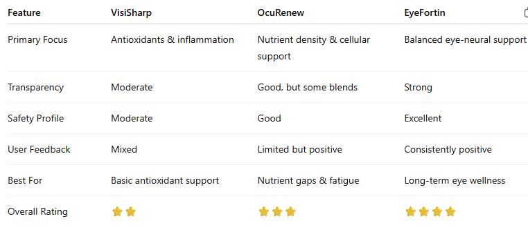 Compared to the other two, EyeFortin places a stronger emphasis on consistent safety, ingredient clarity, and user experience.