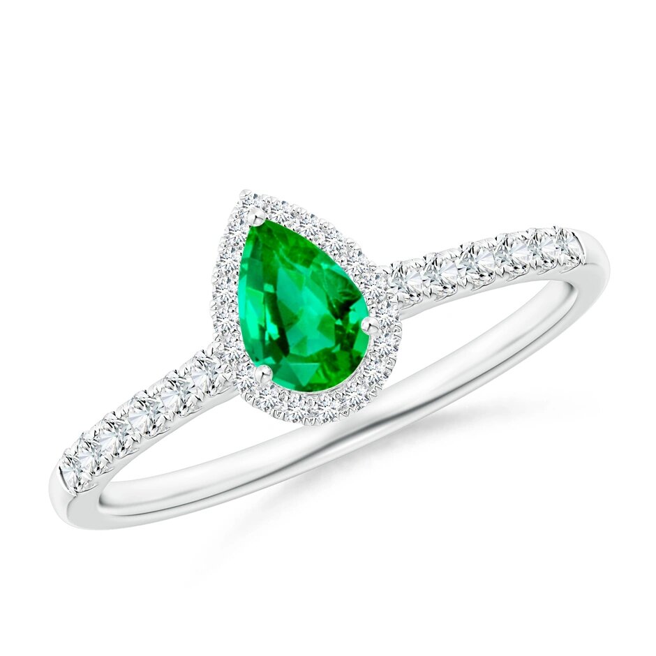 Embrace timeless elegance with our Pear-Shaped Emerald Halo Engagement Ring, now available at a discounted price of 12% off. This stunning ring features a pear-shaped emerald, delicately cradled within a shimmering halo setting held by prongs. Adding to its allure, dazzling diamonds cascade down the shoulders, enhancing its brilliance and beauty. Crafted from 14k white gold, this engagement ring exudes sophistication and charm, making it a sparkling symbol of your love and commitment.