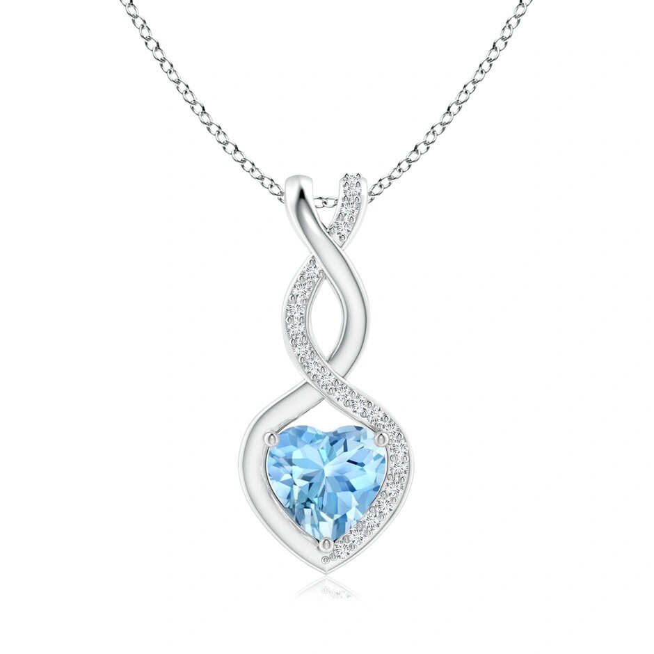 Our Aquamarine Infinity Heart Pendant with Diamonds, now available at a discounted price of 12% off. This exquisite piece features a captivating design where a diamond-studded strip intertwines with a lustrous metal strip to create a beautifully intricate infinity symbol. Nestled within this graceful infinity is a stunning icy blue heart-shaped aquamarine, delicately held in place by prong settings. The sparkling diamonds add a mesmerizing touch to this pendant, crafted from 14k white gold, making it a truly enchanting addition to any jewelry collection.