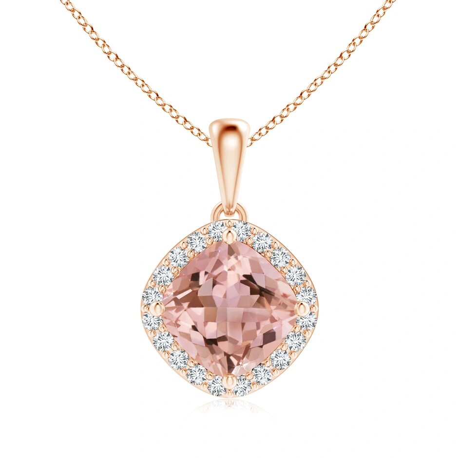 Embrace elegance with our Sideways Cushion Morganite and Diamond Halo Pendant, now offered at a charming 12% discount. Crafted with care, this pendant features a captivating design in 14k rose gold, adding a touch of romance to any ensemble. The cushion-cut morganite, set sideways in a secure claw prong setting, exudes a unique charm, while the surrounding halo of diamond accents adds a brilliant sparkle. Suspended from a simple yet lustrous bale, this pendant is sure to make a statement wherever you go.