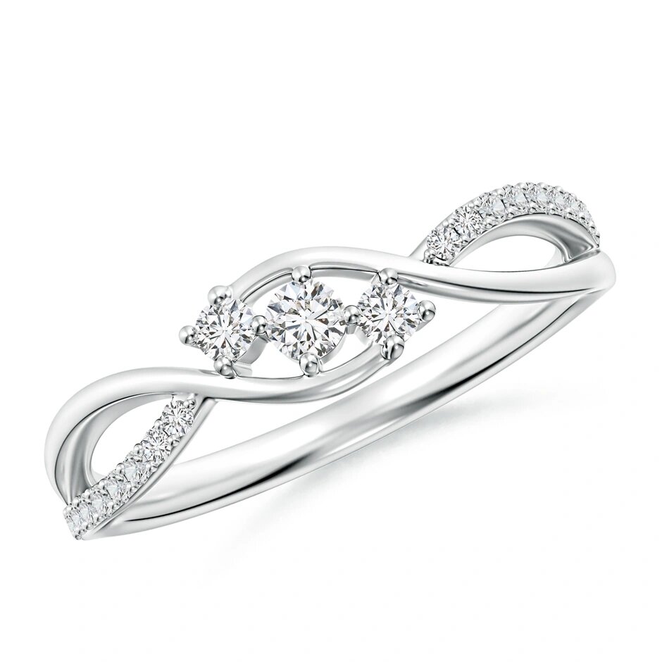 The Diamond Infinity Twist Three Stone Bypass Ring is now available at a 12% discount. This elegant piece features a glistening 14k white gold bypass shank that gracefully twists into an infinity knot. The shank is partially adorned with diamond accents and secures three round diamonds arranged diagonally at its center. This stunning ring beautifully represents infinite love and makes a perfect, timeless addition to any jewelry collection.