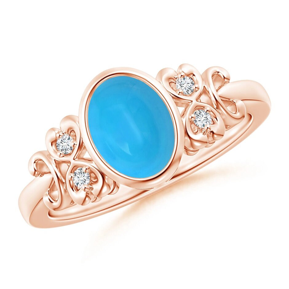 The Vintage Style Bezel-Set Oval Turquoise Ring with Diamonds, priced at $1328, exudes luxurious allure inspired by vintage aesthetics. This exquisite ring features a striking oval turquoise set in a bezel setting. The 14k rose gold band is adorned with shimmering diamonds, with an ornamental shank that enhances its beauty and sophistication.