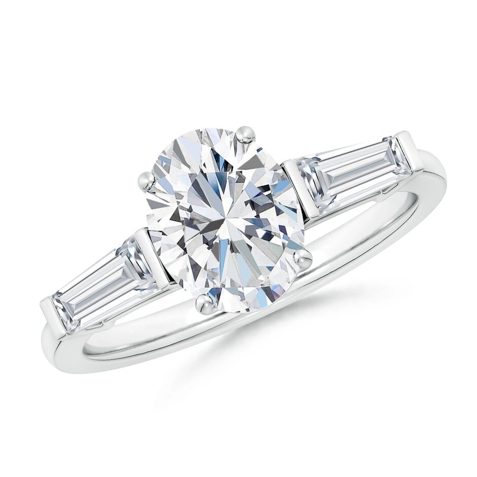 Lab-Grown Oval and Tapered Baguette Diamond Side Stone Engagement Ring, now available at 12% off. This exquisite ring features a lab-grown oval diamond at its center, flanked by tapered baguette diamond side stones. Crafted in 14K white gold, it combines elegance with a modern touch, making it the perfect symbol of your everlasting love.