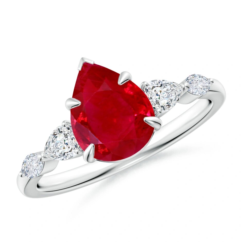 Pear-Shaped Ruby Side Stone Engagement Ring, now available at 12% off. This exquisite engagement ring features a stunning pear-shaped ruby, prong-set on a polished 14k white gold shank. The ring is further adorned with additional pear and marquise diamond accents on the shank, creating a captivating and luxurious design. Perfect for making your special moment unforgettable, this ring is an absolute visual treat.