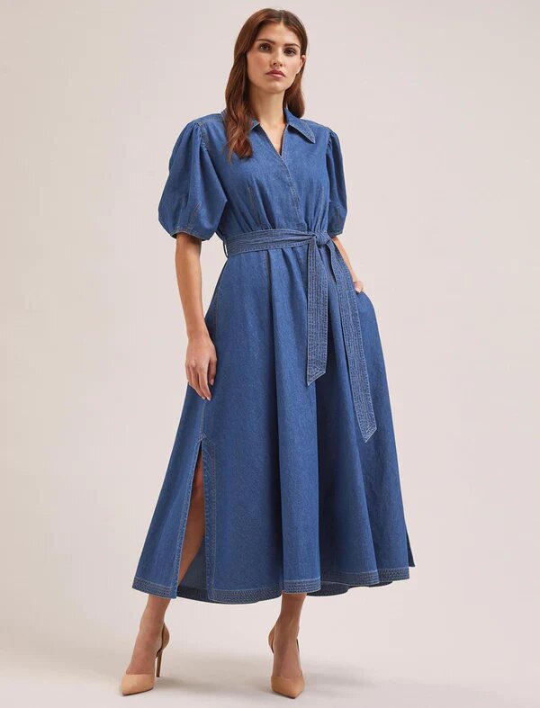 Indulge in the timeless charm of the Wren Denim Maxi Dress in Light Blue, now available for $326 with complimentary shipping. Carefully crafted from 100% cotton denim, this dress offers effortless style and comfort. With a gentle machine wash at 30°C, maintenance is a breeze. Its fixed faux wrap design, full skirt, and fashionable voluminous sleeves effortlessly flatter your silhouette, making it an easy-to-wear essential for any occasion.