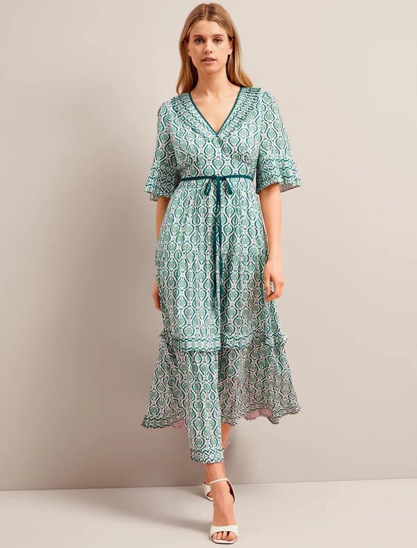 The Cordelia Cotton Blend Maxi Dress in White with Green Tudor Rose Print. Crafted from a luxurious blend of printed cotton viscose voile, this dress features a delightful design inspired by Tudor roses. With a composition of 55% Viscose Lenzing Ecovero and 45% Cotton, it offers both style and comfort. For easy care, simply machine wash gently at 30°C.