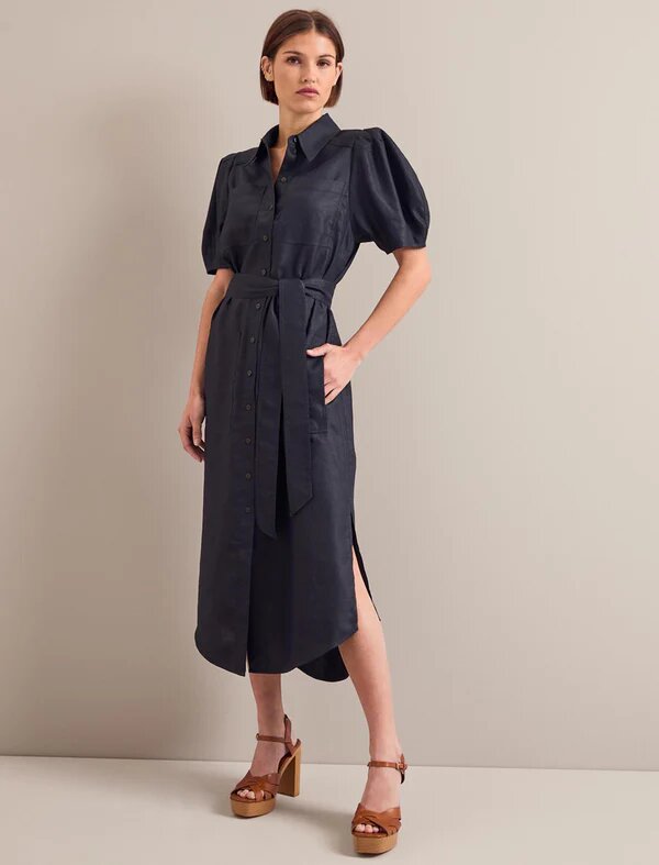 Lyra Techni Linen Maxi Shirt Dress, available for $375 with shipping included. This dress embodies timeless sophistication with its shirt dress silhouette, ensuring a polished look that never fades from fashion. Crafted from Techni-Linen, a high-performance fabric that mimics the appearance of linen but offers superior crease resistance and easy machine washability. Care for this garment with a gentle machine wash at 30°C. Composition: 68% Tri-Acetate, 32% Polyester.