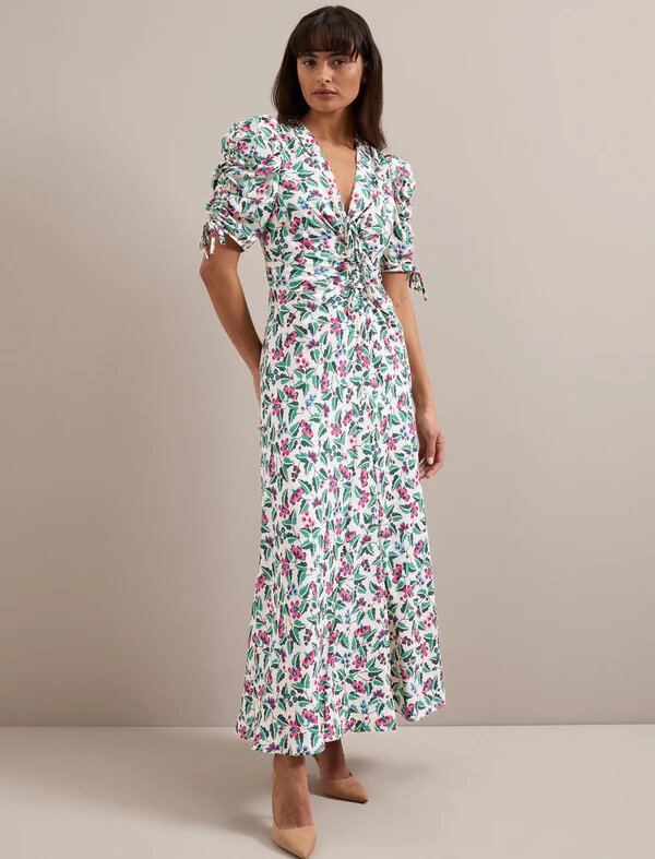 Ophelia Bias Cut Maxi Dress in White Multi Tropical Floral Print. Embrace a vibrant tropical aesthetic with this stunning piece priced at $320, shipping included. Crafted from a blend of 50% recycled polyester and 50% polyester, it features a printed leopard jacquard design. The dress is lined and boasts a flattering bias cut. With a side zip and shirring detail through the back, it offers both style and comfort. Modeled by someone 5ft 10in / 1.78m tall, wearing a size UK10, this dress is designed to fit true to size. Elevate your wardrobe with this effortlessly chic ensemble.